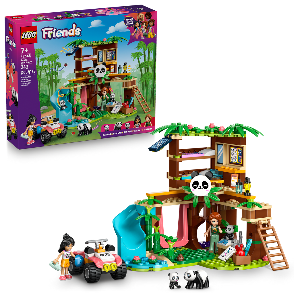 Discover a fun kids’ building set gift that’s packed with panda power! The LEGO® Friends Panda Sanctuary Animal Care (42648) set for girls, boys and animal-lovers aged 7 and up lets kids create their own panda rescue stories. The set comes with a buildable tree house and ATV, 2 minidoll characters and 3 panda figures to inspire creative pretend play.