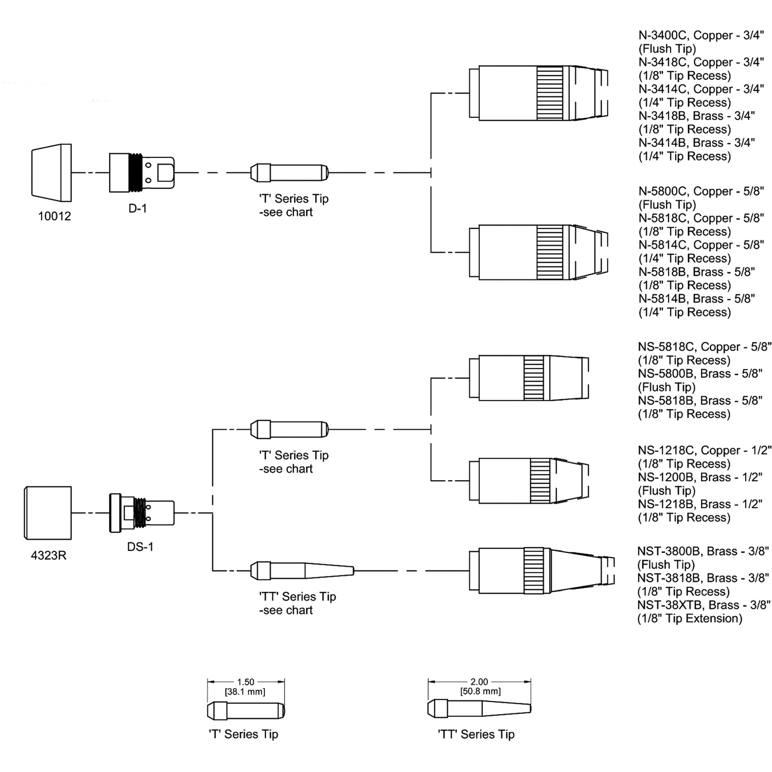 • Threaded nozzle holds tip fixed at 1/8" or 1/4" recess, flush, or 1/8" stick out